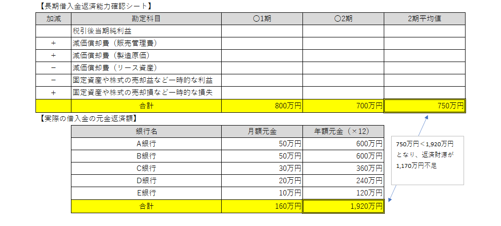 例題(架空A社)上図のケースでは、返済能力750万円(2期間の平均値)に対して、1年間の元金返済(利息は含まないこと!)が1,920万円になっています。