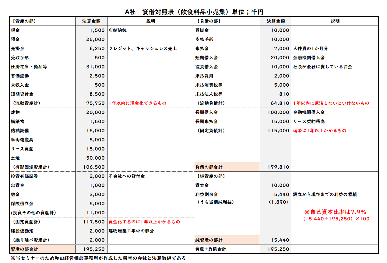 私が作った架空会社A社は、地方都市の食料品小売業です(表のうえ、クリックで拡大します)。